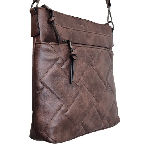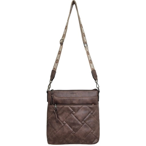 This vegan leather crossbody bag exudes refined elegance with its deep tan color and intricate quilted diamond stitching, creating a textured, sophisticated look. The structured yet supple design ensures practicality while maintaining a polished appearance, making it ideal for both casual and formal settings. A front zipper pocket enhances functionality, providing easy access to essentials. The bag’s main compartment offers ample storage space, with a secure zipper closure ensuring belongings remain protected. Its adjustable strap showcases an eye-catching geometric pattern, adding a stylish contrast to the rich tan vegan leather material. Designed for versatility, the wide strap allows the bag to be worn over the shoulder or across the body, adapting effortlessly to different occasions. With its seamless balance of aesthetic appeal and practicality, this handbag is a timeless accessory that elevates everyday style.